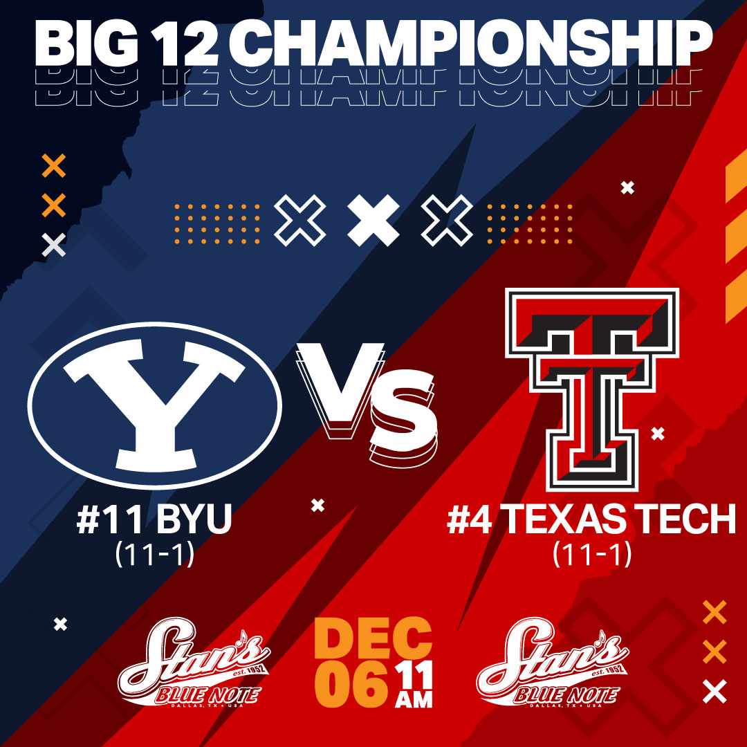 Saturday, December 6, we’re showing the 2025 Edward Jones Big 12 Football Championship on the big screen — Texas Tech vs. BYU kicking off at 11:00 AM. Come watch the game at Stan’s, grab a seat, and enjoy $4.75 domestic drafts until 10 PM!