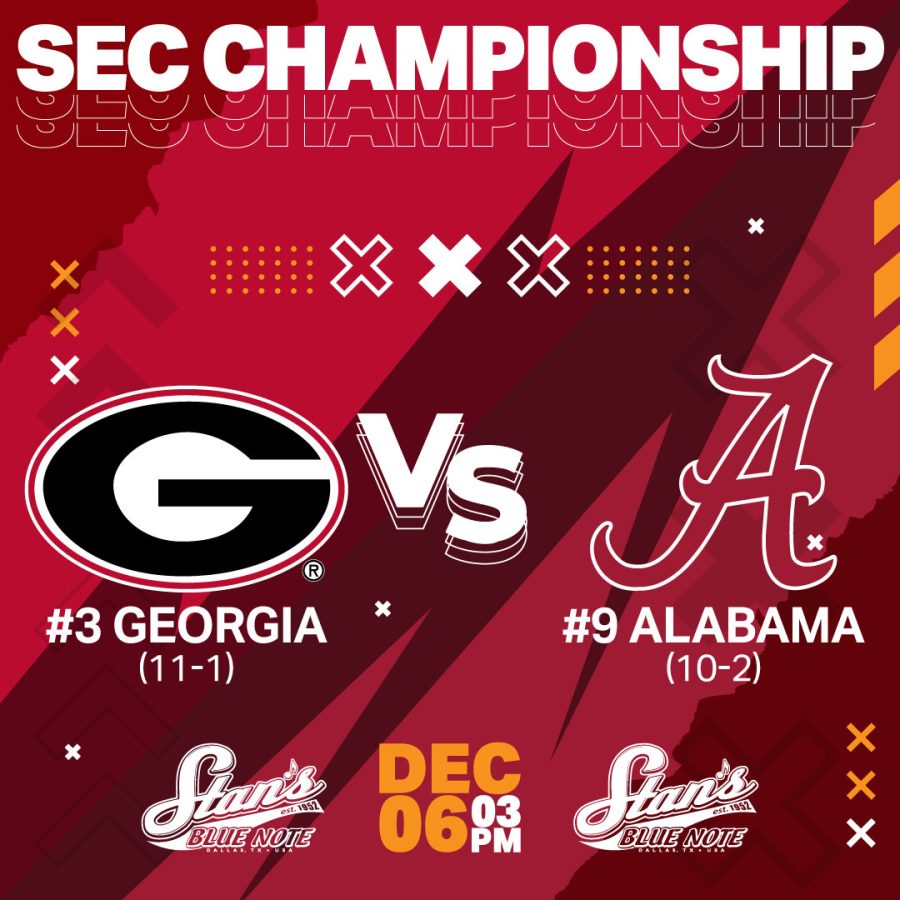 Saturday we’re showing the SEC Championship Presented by Dr Pepper on the big screen — Georgia vs Alabama kicking off at 3:00 PM. Come watch the game at Stan’s, grab a seat, and enjoy $4.75 domestic drafts until 10 PM!