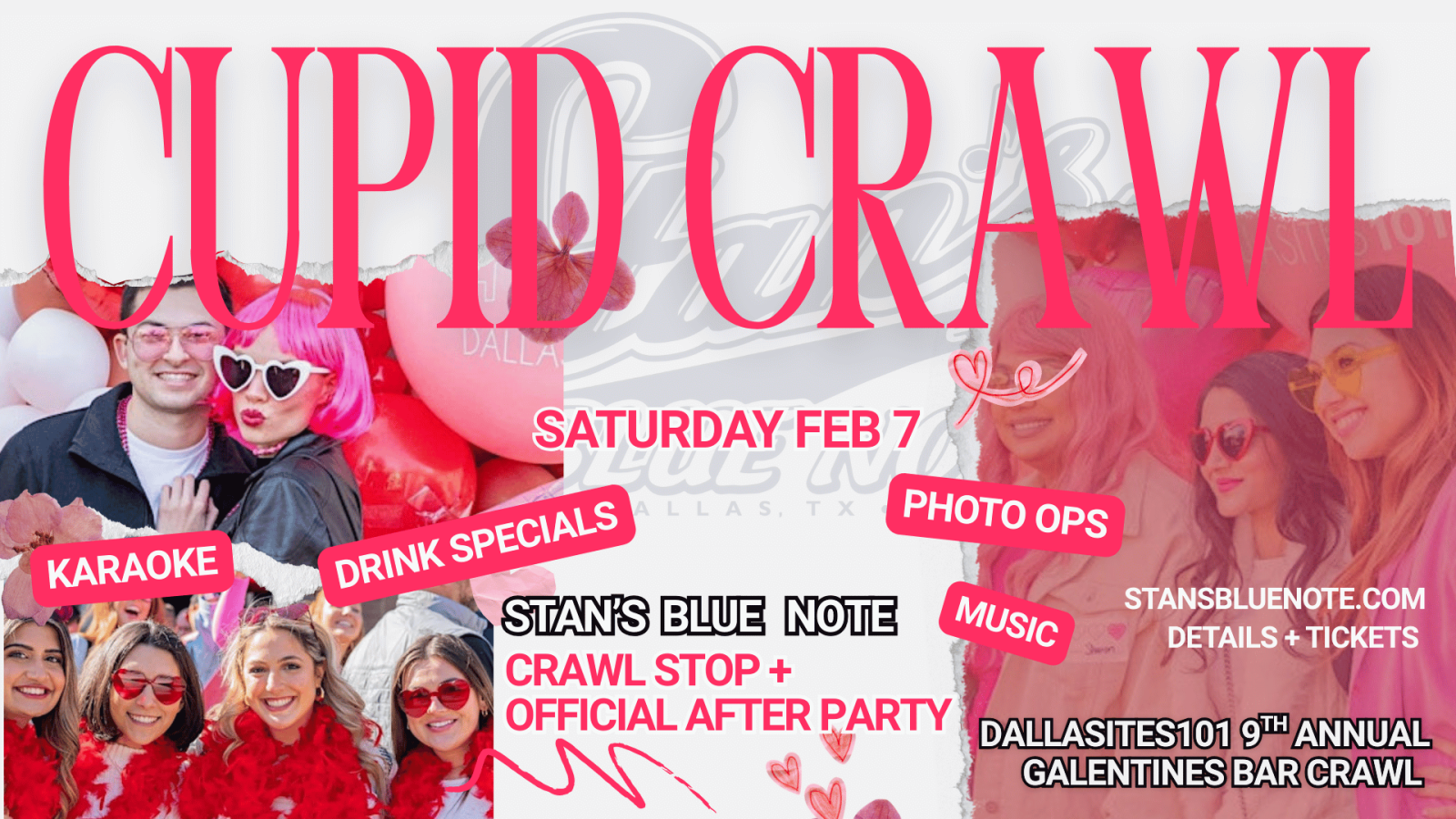 Get ready, Dallas. The 9th Annual Galentine’s Cupid’s Crawl is taking over Greenville Avenue, and Stan’s Blue Note is proud to be a featured crawl stop and the OFFICIAL AFTER-PARTY destination.